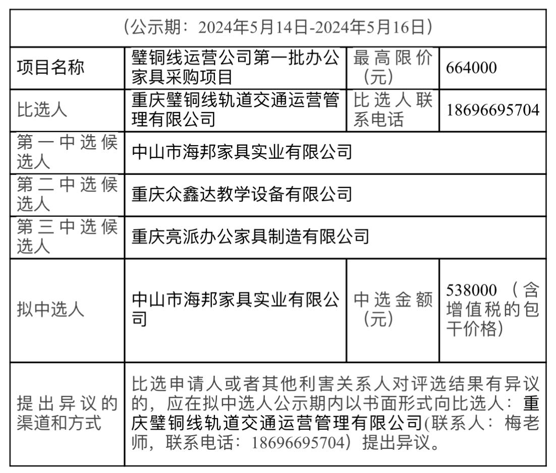 璧铜线运营公司第一批办公家具采购项目竞争性比选结果公示表