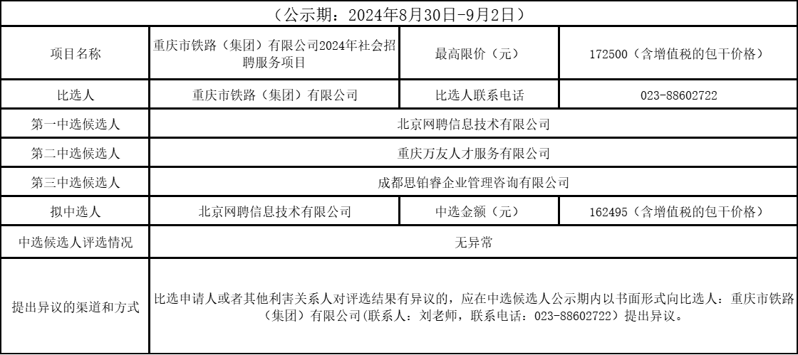 重庆市铁路(集团)有限公司2024年社会招聘服务项目竞争性比选结果公示表